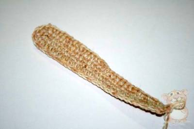 Обвязываем по контуру рядом из простых столбиков без накида, где пальцы вяжем три столбика с накидом. В нужном месте пришиваем пуговицу. Обычными столбиками вяжем лямку с отверстием для пуговицы.