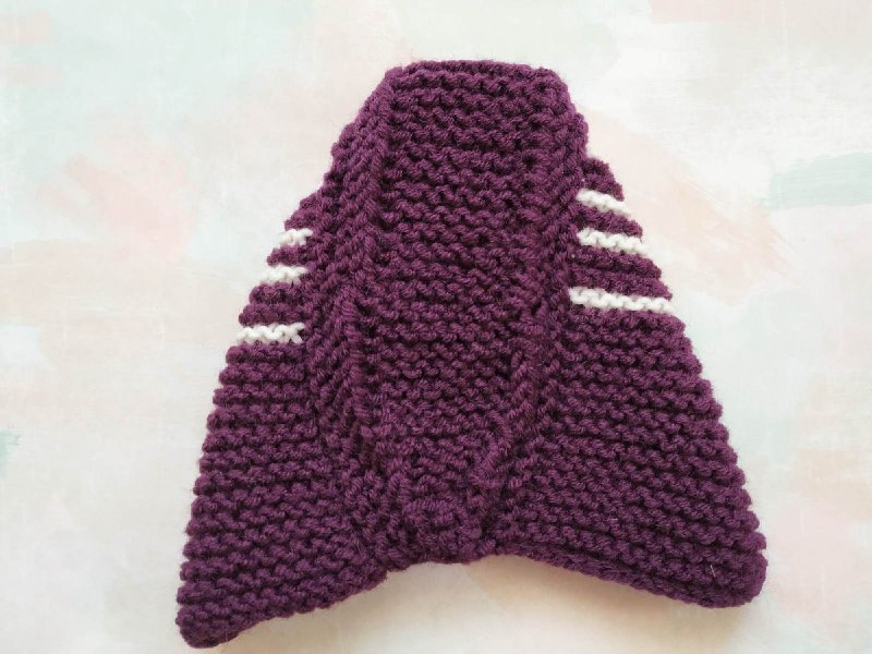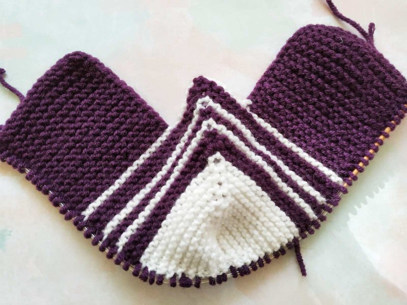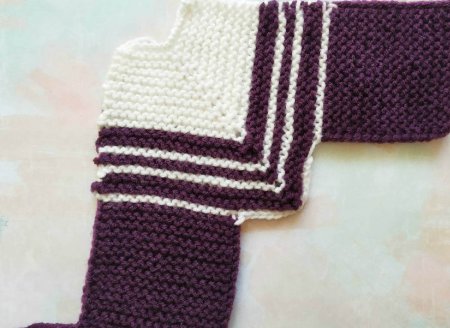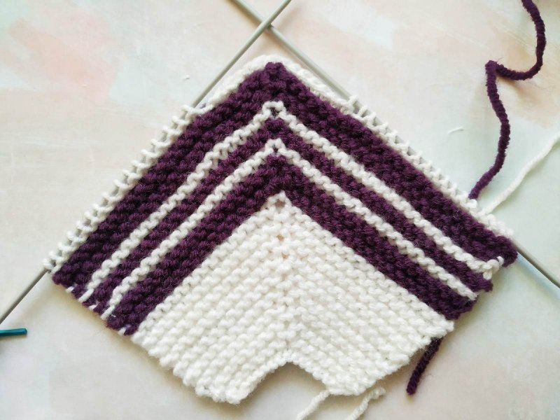 Дальше вязать по той же схеме, но со сменой нити. Сначала 3 ряда фиолетовой. Затем 2 ряда белой ниткой. Далее 2 ряда фиолетовой, 2 ряда белой и 3 ряда фиолетовой.