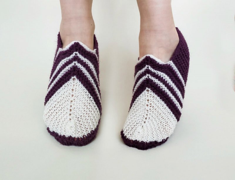 Дальше провязать фиолетовой ниткой необходимое количество рядов платочной вязкой. Количество рядов зависит от длины стопы. Для 36 размера нужно выполнить 36 рядов.