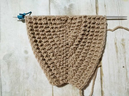 Теперь все петли вяжем лицевыми. По центру выделяем 11 петель. Сначала 1 центральную, затем по 5 петел в обе стороны. Вяжем лицевыми петлями до первой отметки. Провязываем 10 петель лицевыми. Затем 2 вместе изнаночной. Разворачиваемся, снимаем кромочную. Далее 9 петель лицевых, 2 вместе лицевой. Этот ряд повторяем, пока не останется по 9 петель. В лицевом ряду 2 вместе провязываем лицевой, в изнаночных – изнаночной.