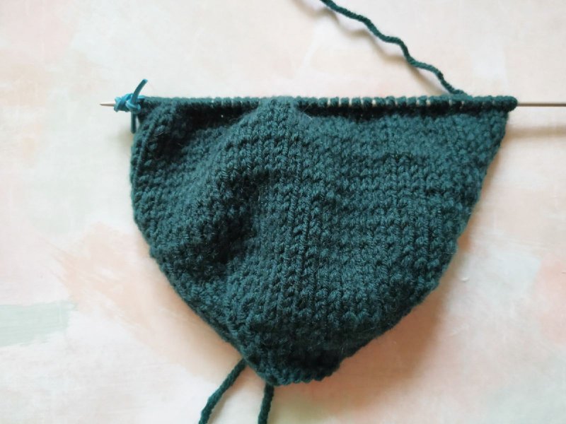 Дальше вяжем лицевыми петлями до последних 4 петель. Здесь тоже делаем прибавку, затем провязываем лицевую, опять прибавляем петлю. Довязываем ряд лицевыми, последнюю петлю вяжем изнаночной. Петли, которые находятся между прибавками можно отметить маркерами. Так будет удобней. То есть, это 4 петли по счету от начала ряда и от конца.