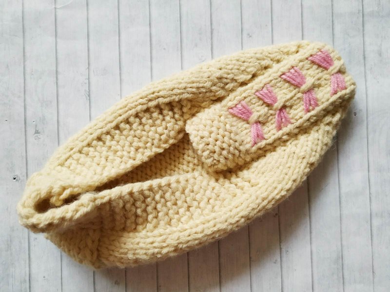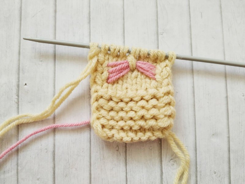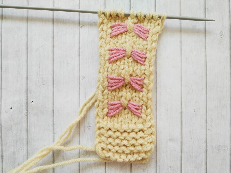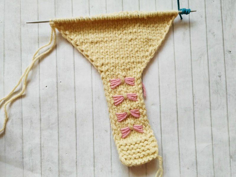 Далее будем формировать 4 бантика. Для этого берем нить другого цвета и привязываем к началу вязания. Но начинаем той же нитью, что и до этого. Снимаем кромочную. Вяжем лицевую петлю. Затем розовую нить вытаскиваем перед спицей. Далее вяжем 5 лицевых. Затем розовую нитку протаскиваем на изнаночную сторону и довязываем ряд лицевыми петлями. Кромочную выполняем изнаночной.