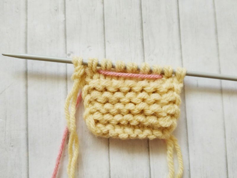 В следующем ряду вязать будем изнаночными петлями. И далее будем выполнять вязание лицевой гладью. Вяжем точно так же, только изнаночными петлями. Затем провяжем еще 2 ряда (лиц, изн). Получится 4 розовые полоски.