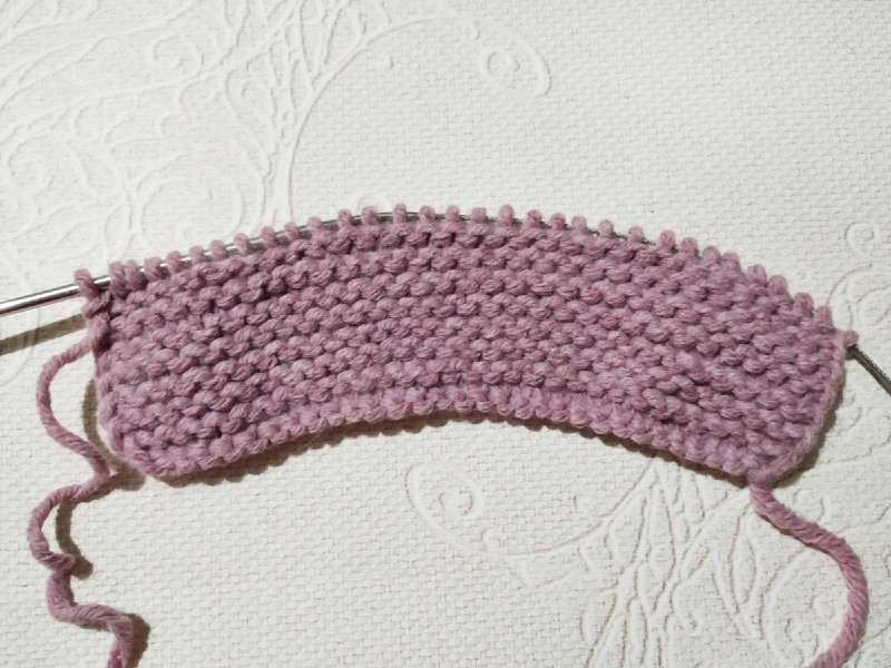 Вяжем вверх платочной вязкой. Вязать будем до тех пор, пока эта деталь не достигнет нужной длины. Она должна быть точной такой же в длину, как часть полотна с закрытыми петлями.