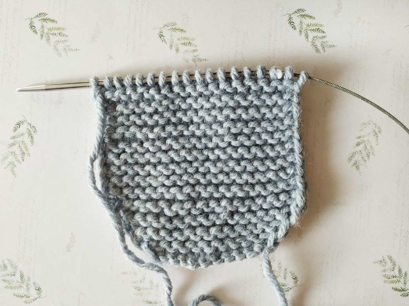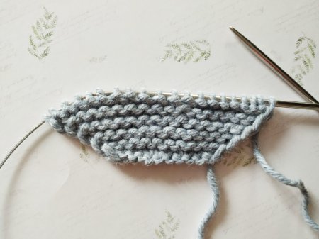 На спицы набираем 12 петель. Далее провязываем ряду с прибавлениями. Прибавлять будем в каждом ряду. Вязание осуществляем платочной вязкой, то есть, в каждом ряду провязываем только лицевые петли. Чтобы сделать прибавления, нужно снять кромочную, добавить петлю обычным способом, затем провязать лицевые до 2 последних петель. Провязываем лицевую, добавляем петлю и провязываем изнаночную петлю, так как крайняя петелька – кромочная. Она во всех рядах будет вязаться изнаночной.