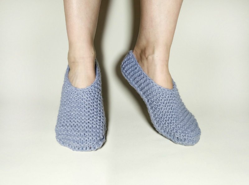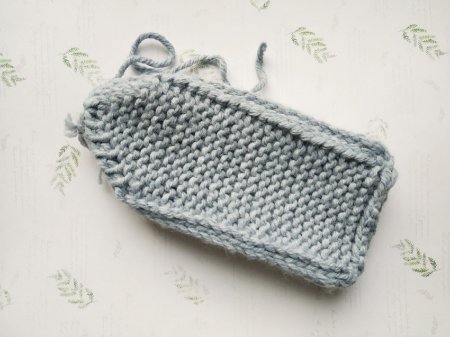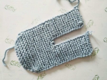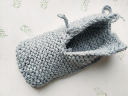 Дальше вяжем оставшуюся половину ряда. Разворачиваемся и провязываем теперь только половину петель. Вяжем, пока эта деталь не закроет пятку, но при этом оставляем немного на растяжение, так как платочная вязка хорошо тянется. Лучше связать следки немного меньше, чем требуется на определенный размер. Закрываем петли.
