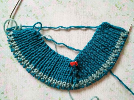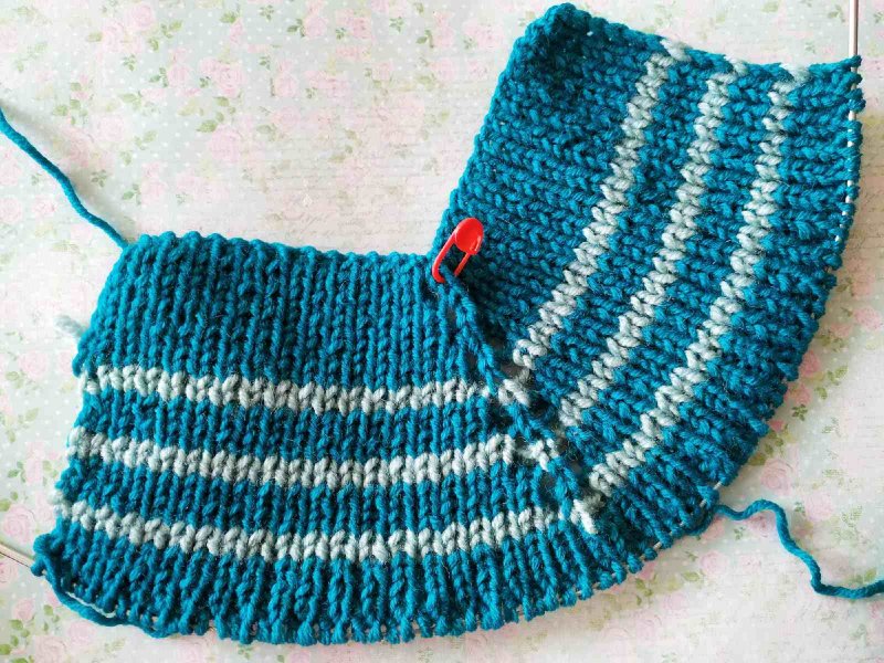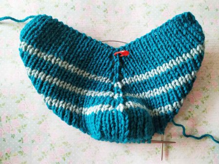 Синей нитью провяжем всего 4 ряда, затем 2 голубой. И так все время до тех пор, пока с обеих сторон от петли с маркером не получится по 40 петель.