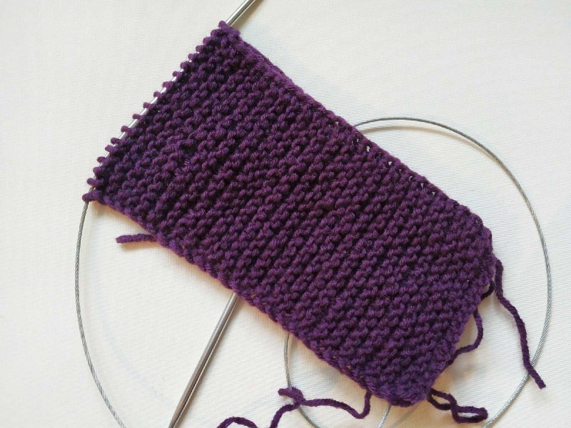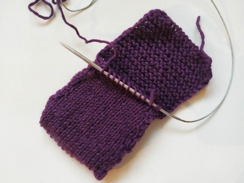 На спицы набираем количество петель необходимое для ширины стопы. В данном случае набрано 18 петель. Затем выполняем вязание простым узором – платочная вязка. Все петли в каждом ряду вяжем лицевыми, кроме первой и последней. Первую переносим на правую спицу, а заключительную петлю провязываем изнаночной.
