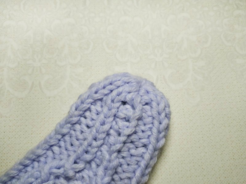 Теперь осталось собрать носок. Для этого провяжем ряд по 2 петли вместе лицевой. Затем соберем все петли на крючок и протянем через них нить. Хорошенько стянем петли и зафиксируем. Так мы сформировали носок следка.