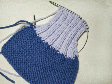 Затем меняем нить и провязываем так: кромочная, (2 лицевые, изнаночные) – повторять весь ряд до последней петли. Ее вяжем изнаночной, так как она кромочная.