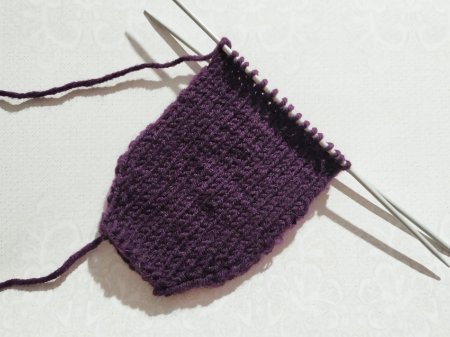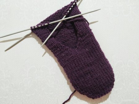 На 2 спицы набираем 20 петель. Одну вынимаем. Провязываем 10 лицевых. Спицу оставляем, провязываем 10 лицевых на 3 спицу. То есть у на по 10 петель на 2 спицах. Третьей будем вязать. Вяжем по кругу. Все вязание осуществляем лицевой гладью.