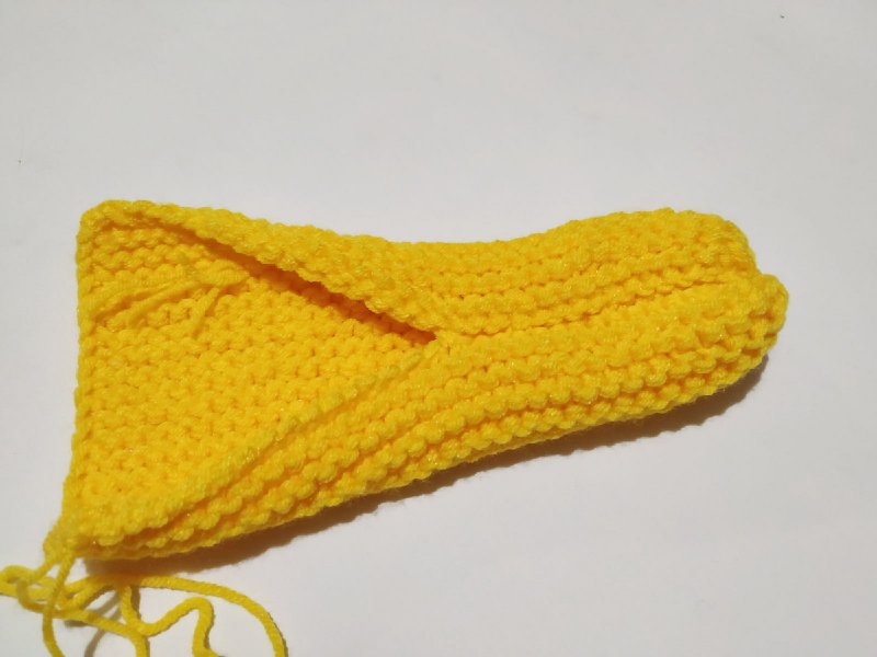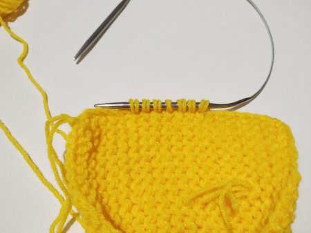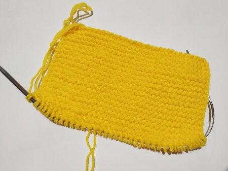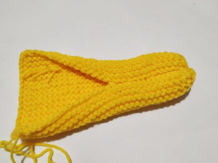 Далее вяжем платочной вязкой. То есть, выполняем все петли лицевыми. Количество рядов зависит от обхвата стопы. Можно примерять полотно. Когда оно будет сходиться сверху, то больше вязать не нужно.