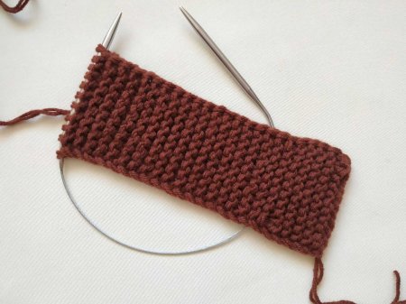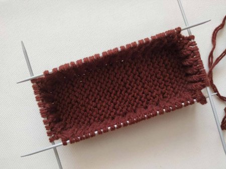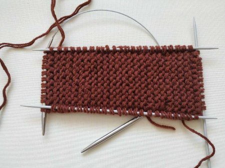 Дальше провязываем по кругу 4 ряда изнаночными петлями. Можно связать и 5 или 6 рядов, тогда объемная полоска сверху будет толще. Фиксируем нить и обрезаем ее. Прячем внутри между петельками.