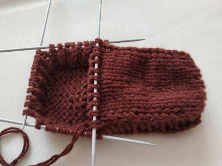 На спицы набираем петли, исходя из ширины стопы. Далее провязываем ряды платочной вязкой. Первую петлю ряда просто снимаем, далее вяжем все лицевыми, а затем последнюю петлю провязываем изнаночной. Так в каждом из рядов. Сколько рядов связать зависит от длины стопы.