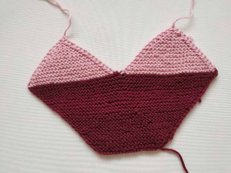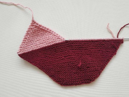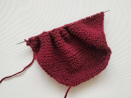 Теперь меняем нитку и провязываем ряд без прибавок. Затем половину петель переносим на дополнительную спицу. А по второй половине вяжем, чередуя 2 ряда.