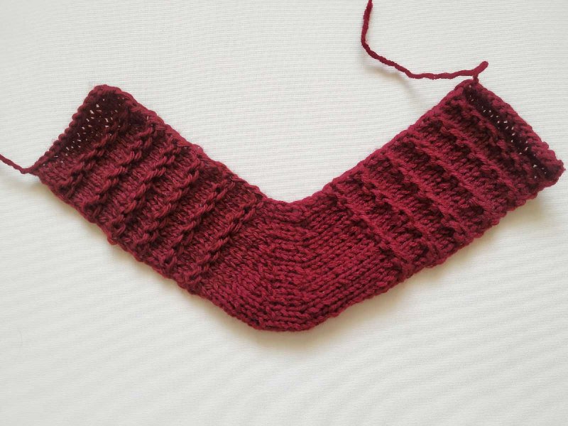 Далее, наоборот, в изнаночном ряду вяжем 2 петли, разворачиваемся. В лицевом просто лицевые. В новом изнаночном ряду вяжем уже 4 петли и разворачиваемся. Затем 6, 8, 10 и так далее.
