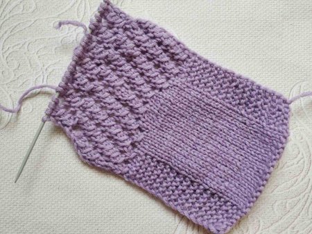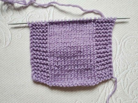 Далее вяжем несколько рядов так: в лицевом ряду провязываем все петли лицевыми. В изнаночном первые и последние 5 петель лицевыми, остальные изнаночными.