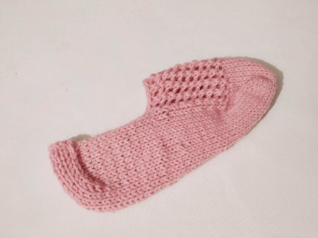 Затем провязываем ряд лицевой гладью. Закрываем петли на верхней спице, но не все. По 5 петель перекидываем к петлям подошвы. Вяжем просто лицевой гладью поворотными рядами. В лицевом ряду – лицевые петли, в изнаночном – изнаночные. Первую петлю просто снимаем, последнюю в каждом ряду вяжем изнаночной. Так вяжем до нужно длины стопы, немного оставив для пятки. Для 38 размера связано 7 см.