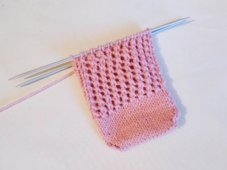 Теперь будем вязать верхнюю часть и подошву сразу. По петлям на одной спицы вяжем лицевой гладью. А по петлям на второй спицы провязываем так: 1 лицевая, накид, 2 петли вместе за задние стенки. И повторяем, накид, 2 вместе, накид, 2 вместе. Так до конца. В конце выполним 1 лицевую.