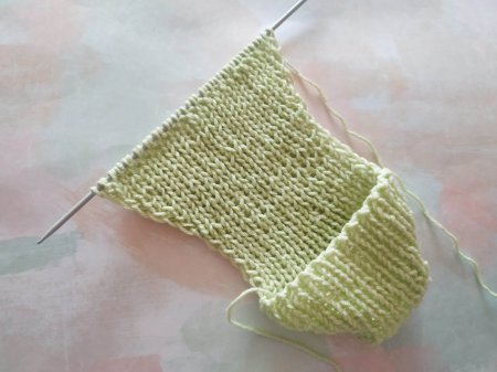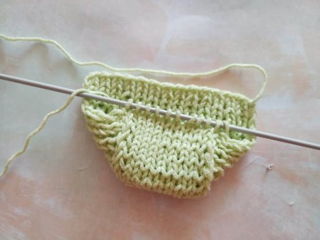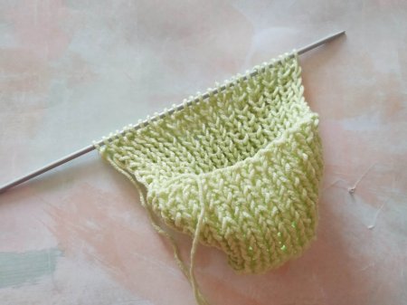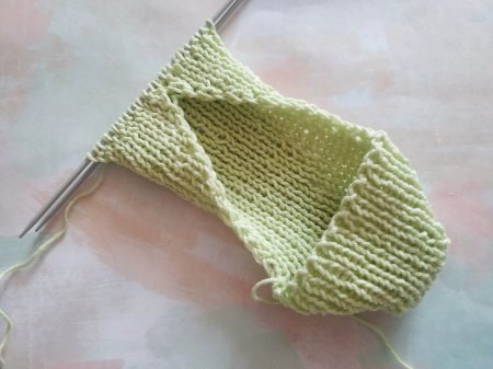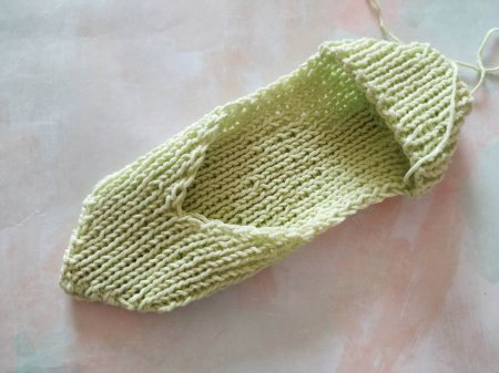 Затем формируем классическую пятку на средних 10 петель. По бокам оставляем по 9 петель. Провязываем 9 петель по центру и 2 вместе в лицевом ряду лицевой, в изнаночном – изнаночной. Разворачиваемся и повторяем ряд, пока не закончатся петли по бокам. То есть, пятку провязываем лицевой гладью.