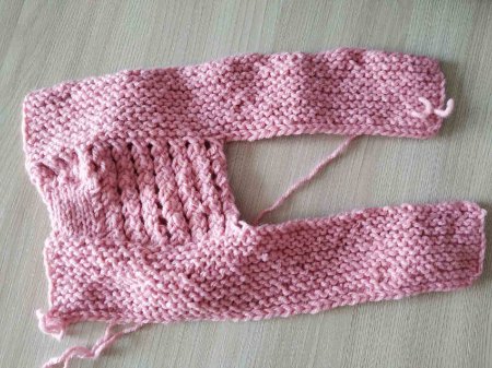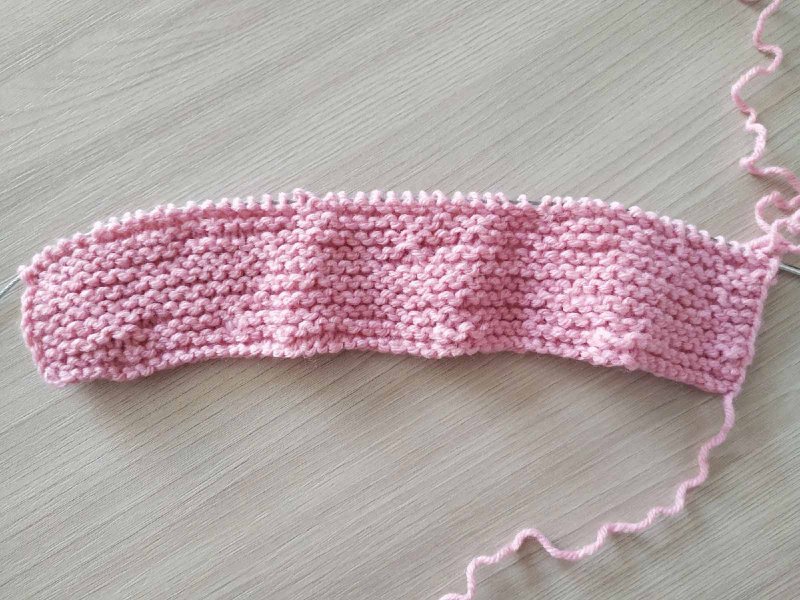 Вяжем платочной вязкой все петли, формируя вторую часть следка. Вяжем столько же рядов, сколько до закрытия петель. Закрываем петли.