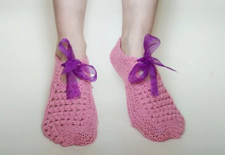 Вяжем второй следок. Можно оставить их в таком виде, а можно украсить ленточкой, продев ее между столбиками с накидом.