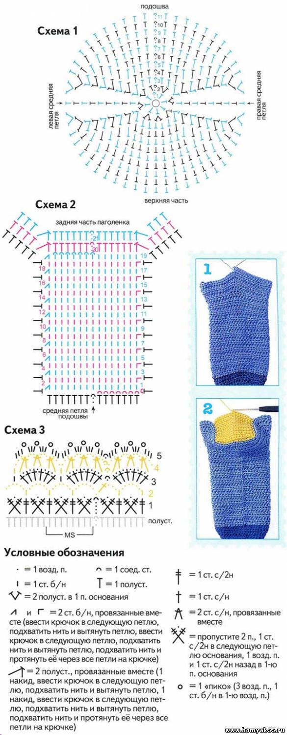 Для правого носка разноцветной нитью выполните начальную петлю и свяжите круговыми рядами 7 (8) 9 рядов по схеме 1 = 36 (40) 44 петель. Затем вяжите полустолбиками. Через 13,5 (16) 19 см от начала вязания прибавьте для пятки и клина подъёма с обеих сторон от обеих средних петель в каждом ряду 5 (5) 6 раз по 1 петле = 56 (60) 68 петель.