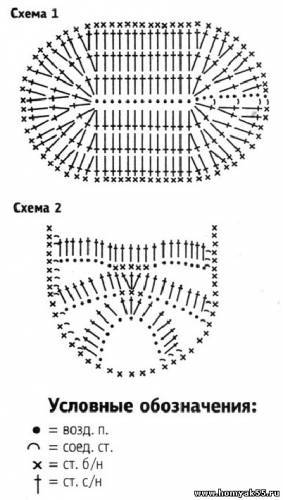 3 СС, 13 ВП, затем ПБН (полустолбик без накида) прикрепите нить к противоположной стороне носика (на расстоянии 5 СБН от начала цепочки). Далее вяжите по схеме 2, исключая СБН.Пяточка