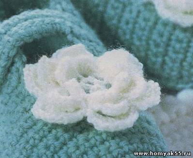 6-й ряд: * (1 СБН, 2 ССН, 6 С2Н, 2 ССН, 1 СБН) в арку из ВП; повторить от * 5 раз, ССв основание 1-го СБН. Закрепить нить, оставив конец длиной приблизительно 10 см, чтобы прикрепить розочку к туфельке.