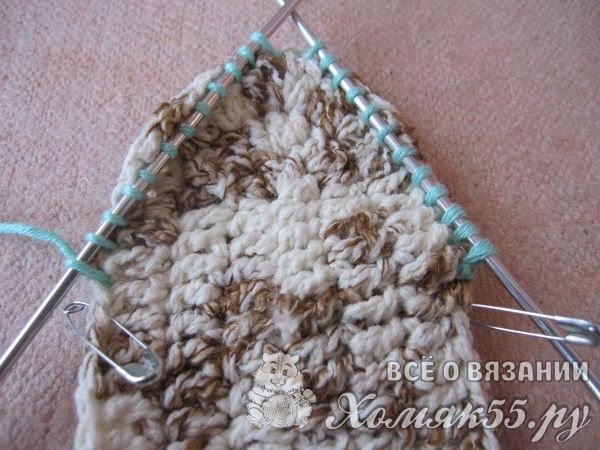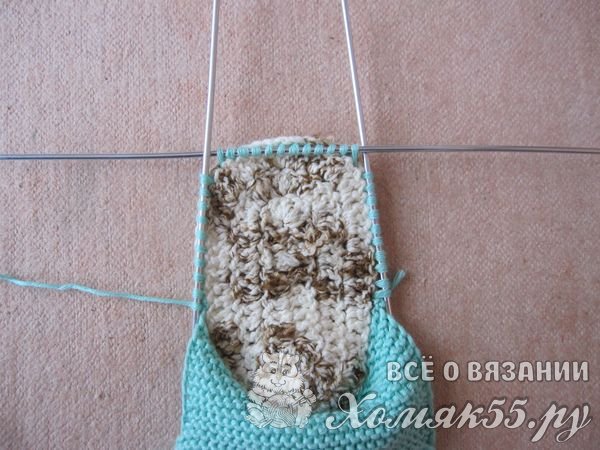 Сделать прибавки как на пятке. На спицах должно собраться 40 п. Провязать 8 рядов. Петли перенести на одну спицу. Далее в каждом четвертом ряду следует делать убавки, провязывая по 3 п. вм., располагая центральную п. сверху.