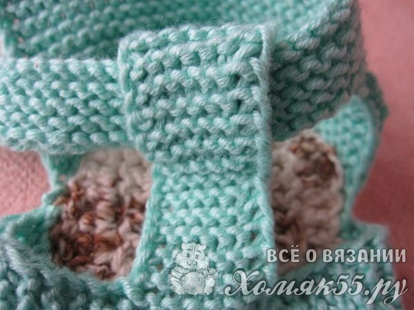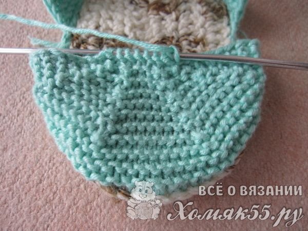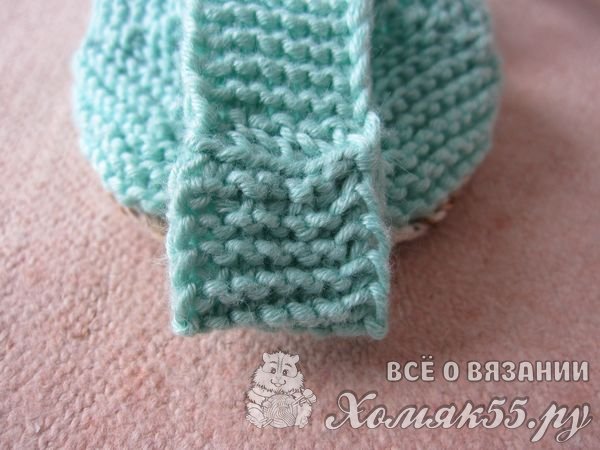 Далее вязать пинетки-сандалии следует спицами пряжей другого цвета поворотными рядами платочной гладью. Подошву необходимо сложить пополам и отметить петли на сгибе булавками или маркерами.
