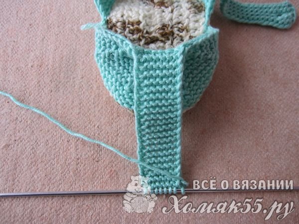 Нужно провязать 18 рядов. Затем все петли следует перенести на одну спицу. В конце очередного лицевого ряда для ремешка необходимо добавить 30 п.