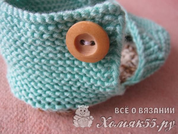 Одна пинетка готова. Вторую следует вязать точно также, но ремешок на пятке необходимо выполнить в противоположную сторону.