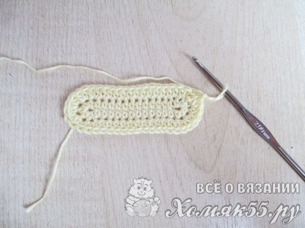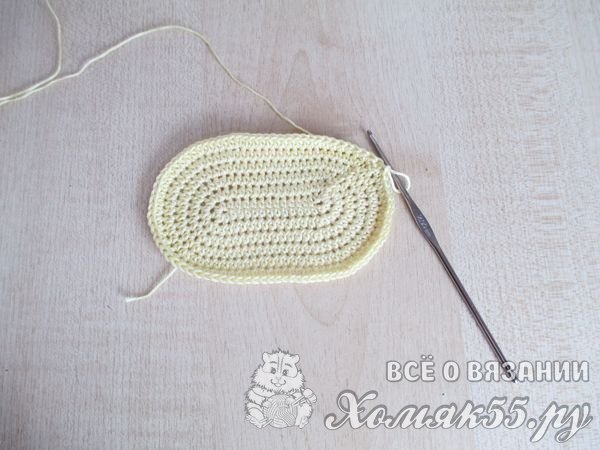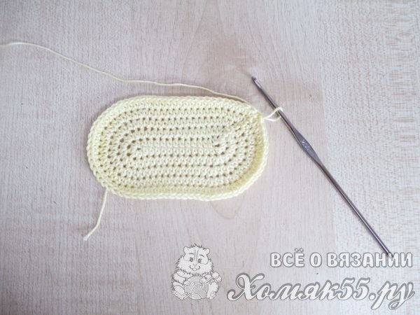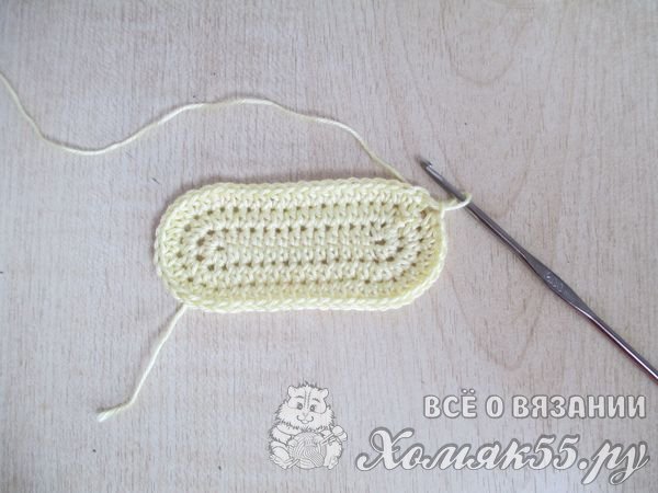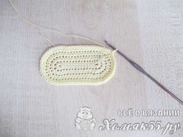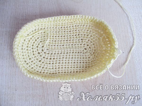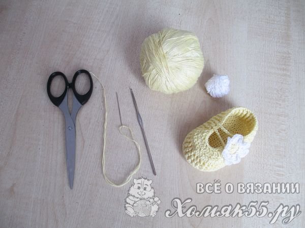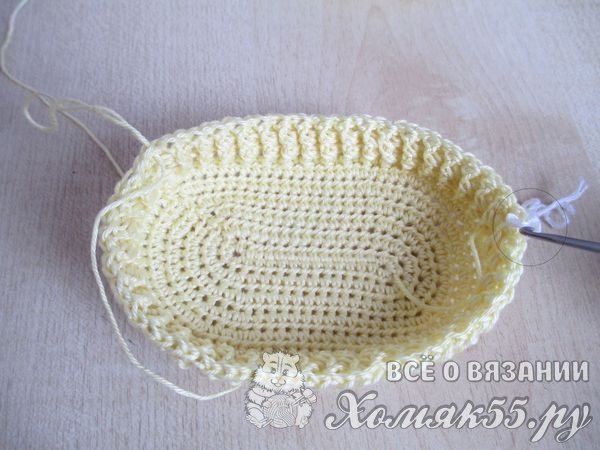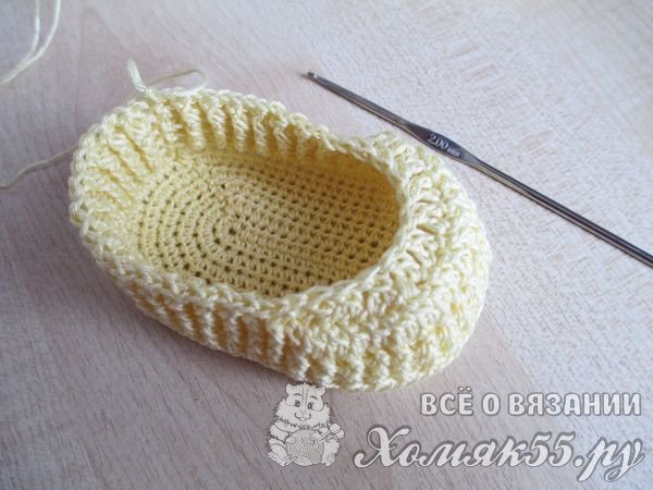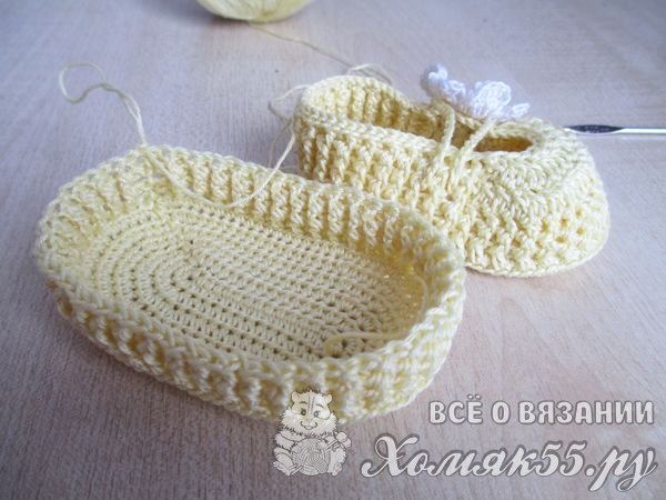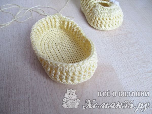 Набрать 40 воздушных петель желтой нитью, обрезать нить, оставив запас в примерно 10 см. Протянуть шнурок через стенку пинетки и соединить в кольцо с изнаночной стороны изделия.