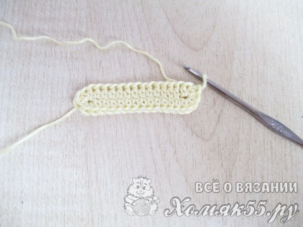 1-й круг. ряд: 1 ПС в 3-ю петлю от крючка, 12 ПС, 5 ПС в 14-ю петлю, 12 ПС, 4 ПС в последнюю петлю, СП.