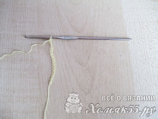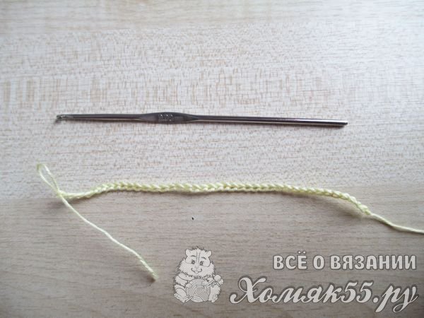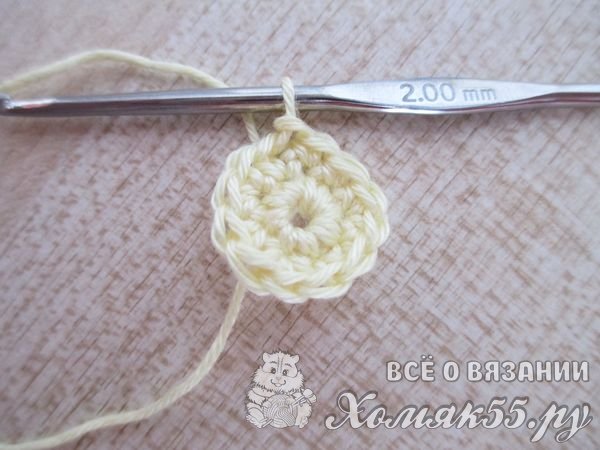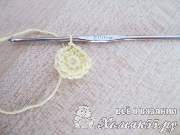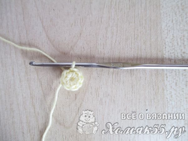 Набрать 3 воздушные петли желтой нитью и соединить в кольцо.