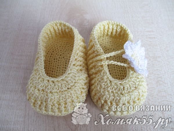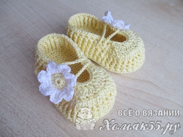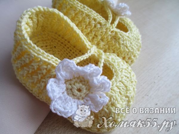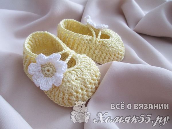 Солнечные пинетки-туфельки, украшенные ромашками, будут гармонично смотреться на весенней или летней детской фотосессии. Они станут не только стильным украшением наряда для вашей малышки, но удобной «обувью». За счет шнурка и ромашки-пуговки пинетки хорошо держатся на ножках. Их вязание благодаря своей простоте не займет много времени, в итоге вы получите эксклюзивный детский аксессуар.