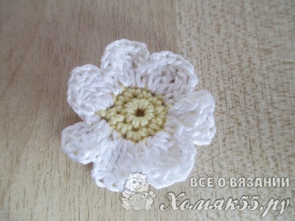 3-й круг. ряд: Присоединить белую нить. 4 ВП, 2 С2Н в ту же петлю, 3 ВП, СБН во 2-ю петлю, * 3 ВП, 3 С2Н в одну петлю, 3 ВП, СБН – повторить 4 раза, СП. Примечание: последняя СП провязывается в 1-ю петлю.