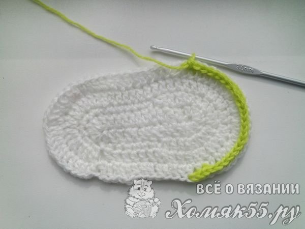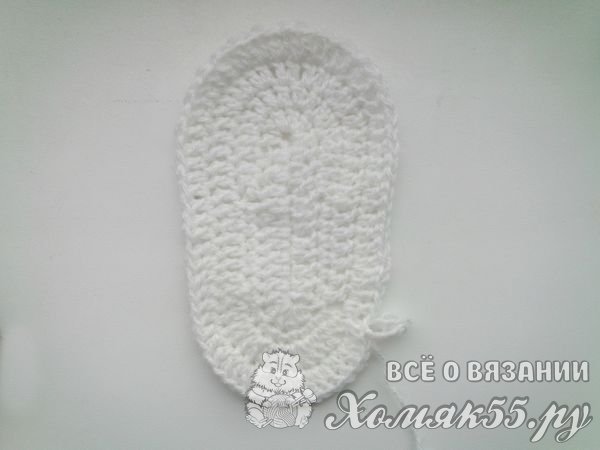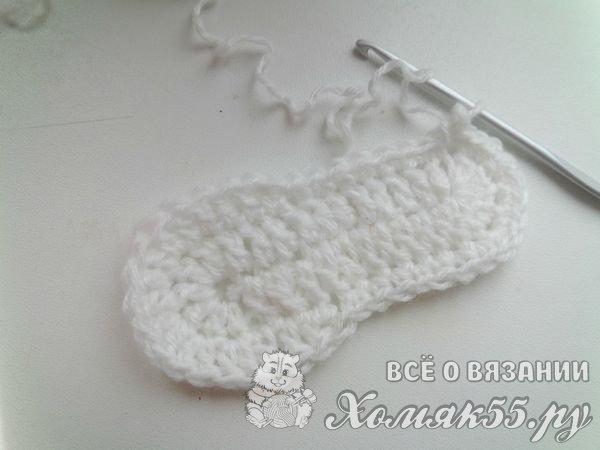 Вязание пинеток будем начинать с подошвы. Набираем 12 ВП белой пряжей. В 4-ую петельку провязываем 1 ССН. Далее в каждую петельку будем вязать по 1 ССН до конца ряда. В последнюю петлю ряда мы должны связать 6 ССН. И снова вяжем по 1 ССН до конца ряда, а в последнюю петельку вяжем 5 ССН. СС соединяем ряд.