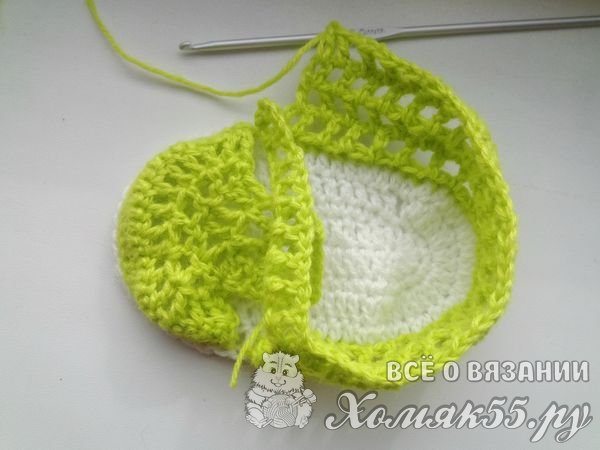 Теперь нам нужно связать оставшуюся часть пинеточка. Вязать будем точно так же как и носочную часть, то есть СБН между петлями предыдущего ряда. Теперь вяжем 2 ВП, пропускаем петельку и вяжем 1 ССН, делаем 1 ВП. Снова пропускаем петельку и вяжем 1 ССН и 1 ВП. Так вяжем до конца ряда. В новом ряду делаем 2 ВП и вяжем в каждую арочку. Повторяем ряд.
