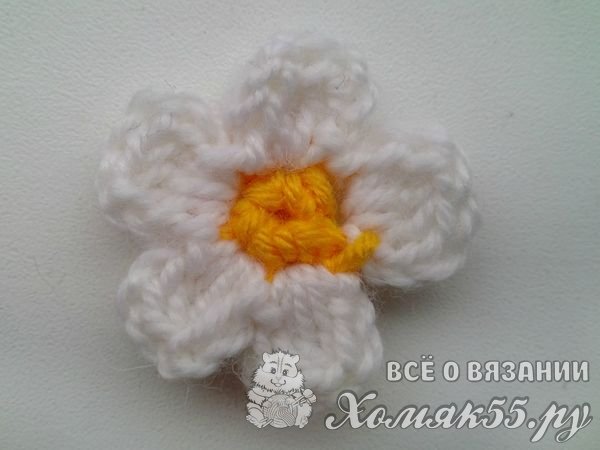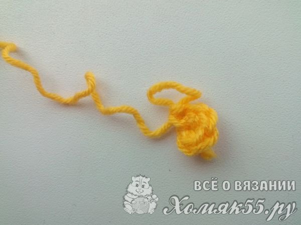 Теперь свяжем цветочек. Желтыми нитками делаем 2 ВП. Далее во 2 петлю вяжем 5 СБН.