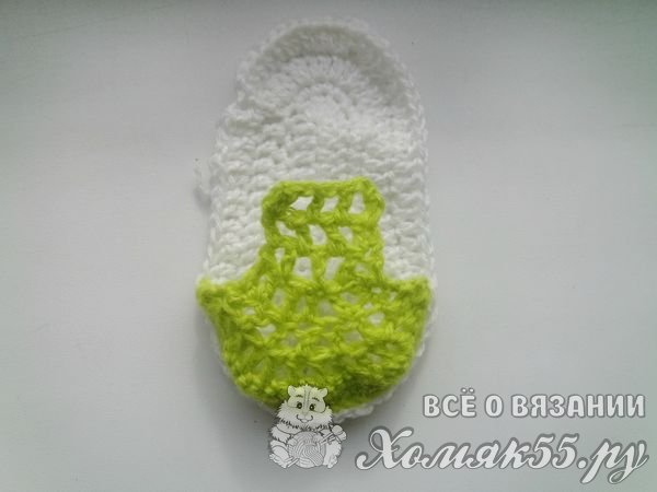 Вывязываем 2 ВП и вяжем последний ряд подошвы точно так же как и предыдущий, только на закругление отводим на носке 8 петель, а на пятке 7.