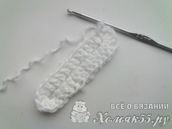 Теперь вывязываем 22 ВП для ремешка. В 4 петлю вяжем 1 ССН. Делаем ВП, пропускаем петлю и вяжем 1 ССН. Таким образом вяжем до конца.