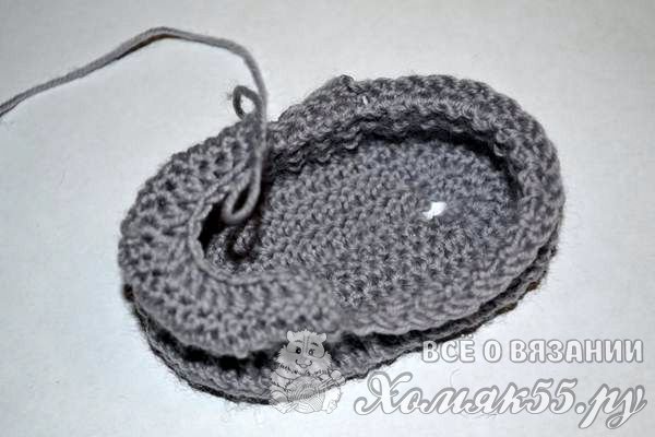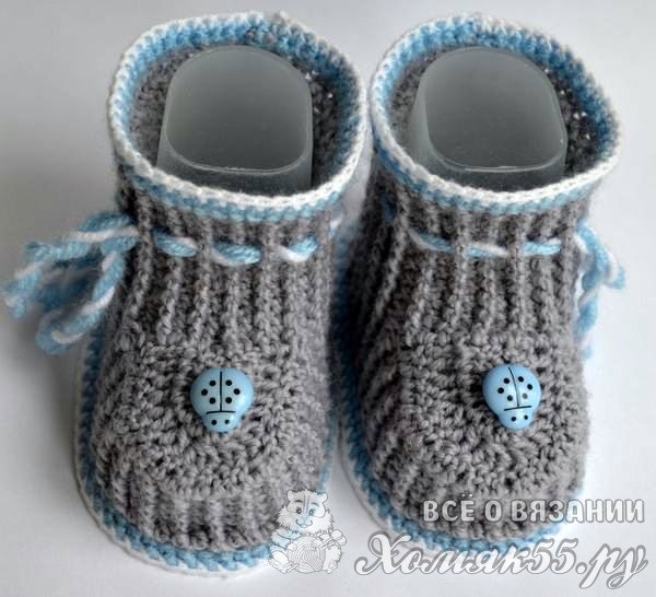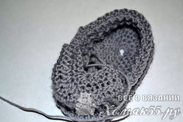 13. Обвязать верх и подошву пинеток контрастным цветом, связать шнурочки, продеть их через выступающие рельефные столбики. Украсить пуговицами или бусинами. Пинетки готовы.