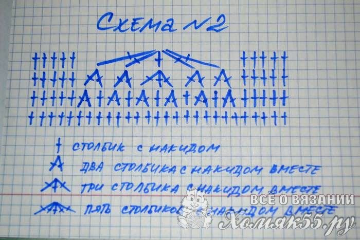 1. Пряжей основного цвета набрать цепочку из 15 ВП. В четвертую петлю провязать 7 ССН и продолжать вязание по схеме №1.