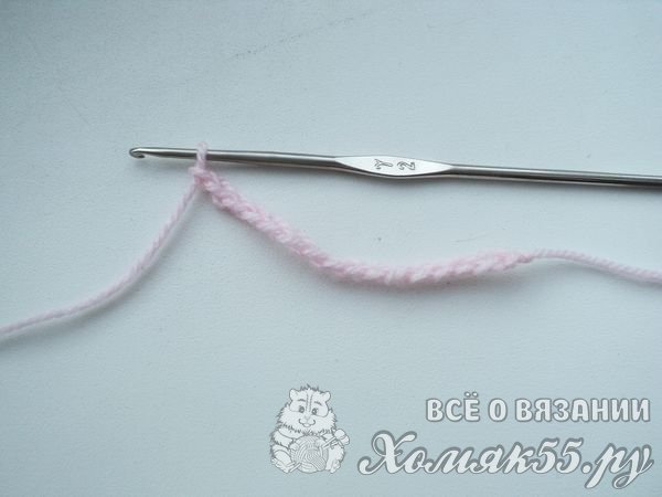 Делаем еще одну петлю и разворачиваем нашу цепочку. Мы будем вязать разворотный ряд. Во вторую петлю от крючка провязываем один столбик без накида. И далее в каждую из петель цепочки будем вязать по одному столбику без накида.