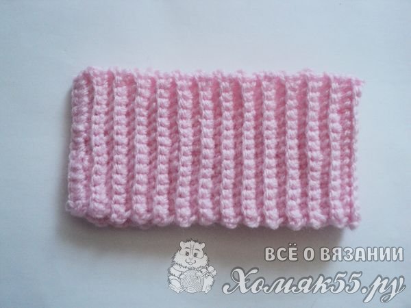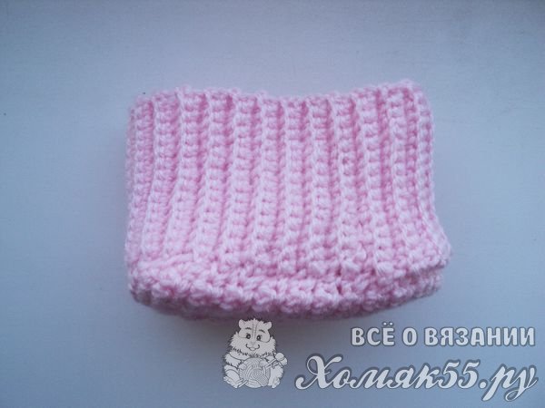 Это верхняя часть пинетки. Теперь свяжем подошву. Ее мы будем вязать не так, как обычно. Нам нужно просто связать полотно. Набираем цепочку из воздушных петель. Их количество должно равняться нашей самой первоначальной цепочки. То есть в данном случае их будет 20. Вязание осуществляем точно так же как и верх пинеток, только вяжем обычными столбиками без накида за обе стенки петли. Длина этого полотна будет равняться половине длины верхнего полотна.