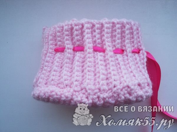 Возьмем атласную ленту и протянем ее по всей окружности пинетки.