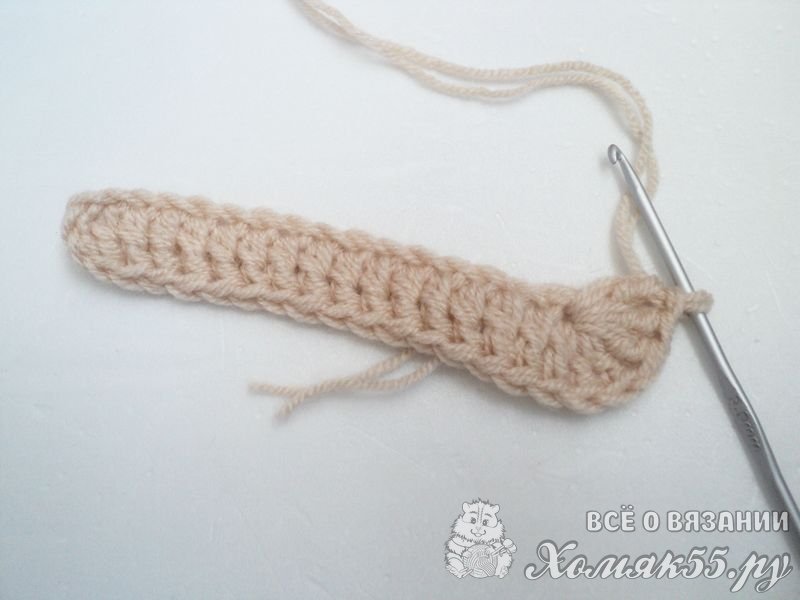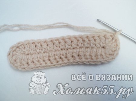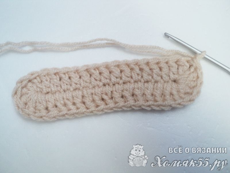 Под воздушную цепочку выполняем 10 столбиков без накида. Теперь между петлями на подошве провязываем 1 столбик без накида. И повторяем последнее действие. Теперь разворачиваем вязание. Со второй петли провязываем по 1 столбику без накида в каждую петлю. И теперь провязываем столбик без накида между петель подошвы на другой стороне. Далее провязываем еще 4 таких ряда. Нить обрезаем.