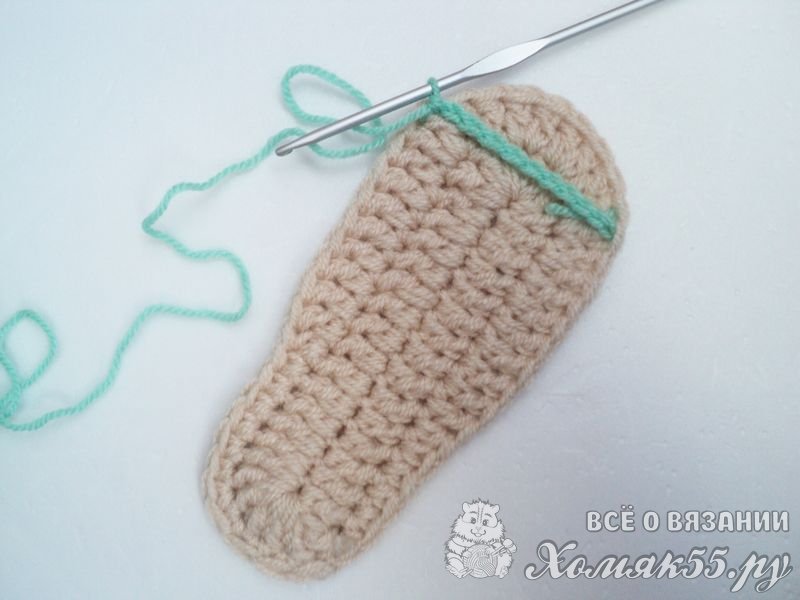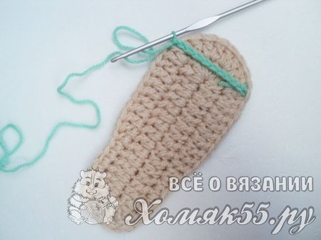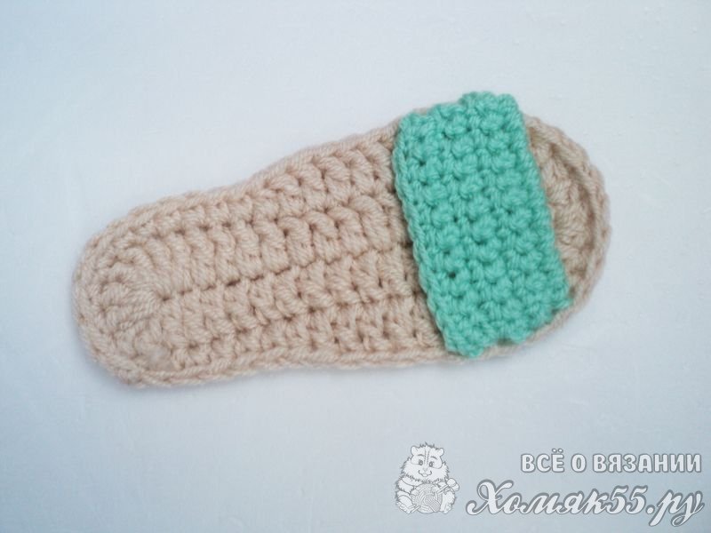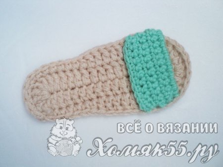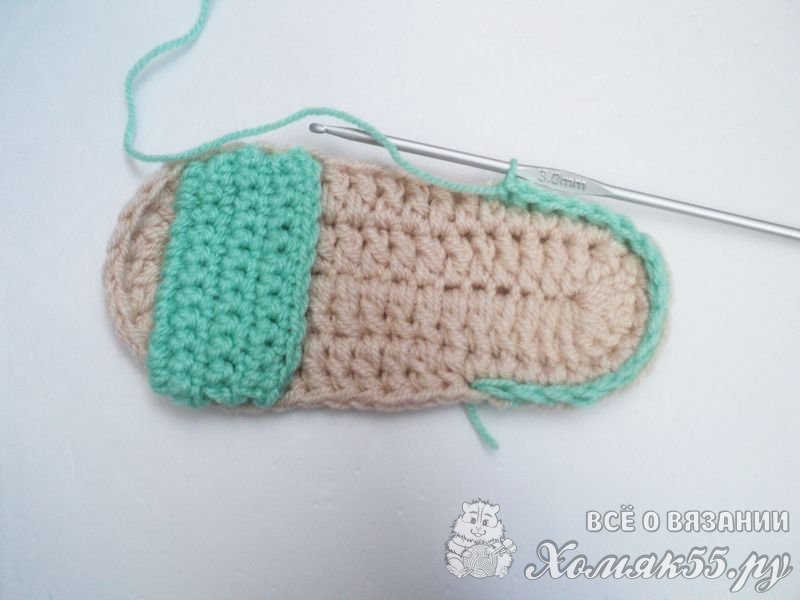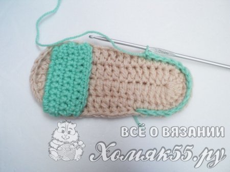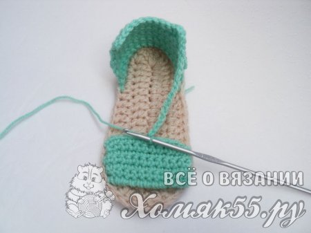 Поворачиваем сандалик пяточкой к себе и находим центральную петлю. Теперь отсчитываем по 8 петель в обе стороны и помечаем их. Присоединяемся мятной нитью и провязываем эти 17 петель между петлями подошвы, выполняя по 1 столбику без накида.